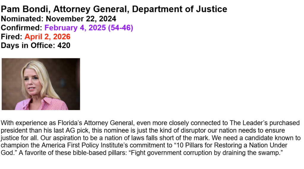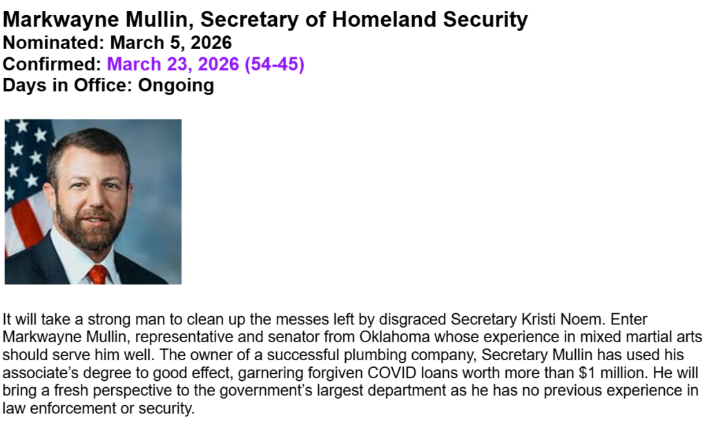 A wee civics lesson … the work of the Executive branch is supported by a cabinet of 15 departments, each with prescribed duties, sub-departments, budgets, and a Cabinet Secretary. If the president is unable to serve, the vice president assumes his responsibilities. After that, succession flows to the Speaker of the House, the President Pro Tempore of the Senate, then the Cabinet members if eligible in the following order.