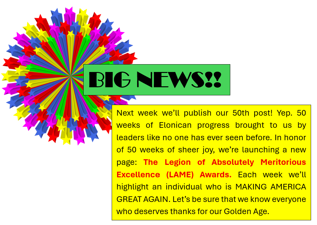With the continuing support of his Avengers, the Supreme Court, and Congress, Unitrump is succeeding in his mission. The illegals are on the run, taking many of their blood-weakening citizen relatives with them. The Radical Left is cowering in fear looking for leadership from a Democrat Party that is stupid enough to shut down the government. Media companies, universities, and law firms are falling into line. Ukraine and Europe have stopped looking for help they never deserved while like-minded South American leaders – in the case of Argentina for the bargain price of only $20 billion dollars – are stepping up to take their place as our new allies. We’re sticking it to China, paying our farmers ourselves rather than letting China pay for our soybeans. Any day now all of this will lead to our Golden Age. Lower prices. Better health. No crime. Unrestricted freedom to speak Elonican truth.