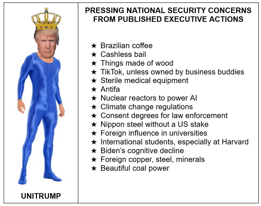 Immediately our new president worked to fulfill the mandate of his unprecedented 1.5% sweeping victory in the 2024 election. He began by assessing myriad threats to our national security. As our “Unitary Executive” (our Unitrump), according to the words and actions of the Supreme Court, his power in matters of national security is absolute. (Now that the Supreme Court has commenced its new session, I bet they further strengthen the presidential hand.) Through a series of thoughtful Executive Actions, Unitrump has identified many national security emergencies, too numerous to document in their entirety. Here are some especially insightful ones: